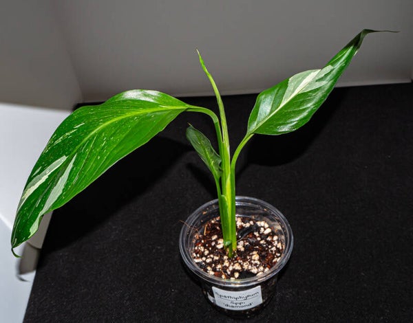 Spathiphyllum spp. ´Diamond´er en sjelden og ettertraktet variant av fredslilje, kjent for sine smale, elegante blader og et unikt mønster i hvitt, grønt og sølv. I motsetning til den vanlige Spathiphyllum variegata, som ofte har mer ujevn og flekkete variegasjoner, har ´Diamond´en mer definert og marmorinspirert variegasjon - ofte med stripete eller spraglete partier som gjør hvert blad til et lite kunstverk.