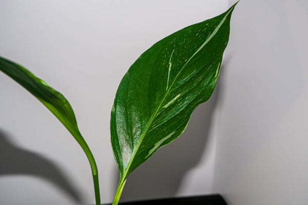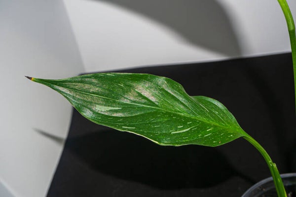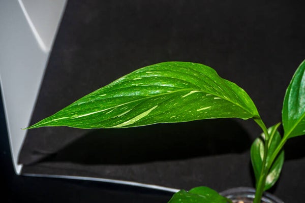 Spathiphyllum spp. ´Diamond´er en sjelden og ettertraktet variant av fredslilje, kjent for sine smale, elegante blader og et unikt mønster i hvitt, grønt og sølv. I motsetning til den vanlige Spathiphyllum variegata, som ofte har mer ujevn og flekkete variegasjoner, har ´Diamond´en mer definert og marmorinspirert variegasjon - ofte med stripete eller spraglete partier som gjør hvert blad til et lite kunstverk.