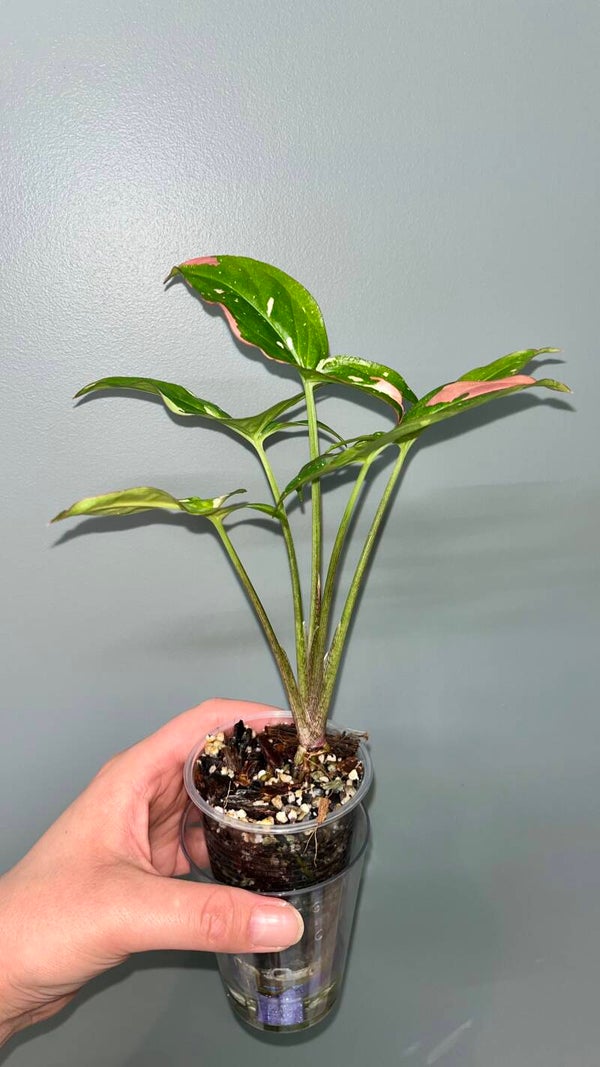 Syngonium Red Spot Tricolor er en av de mest ettertraktede Syngonium-variantene, kjent for sitt spektakulære bladverk med tre fargetoner: grønt, rosa og hvitt. Variegasjonen kan fremstå som alt fra delikate prikker til store fargeblokker, og ingen blader er like. Det rosa kan være svakt pudderrosa eller sterkt bringebærrødt, mens det hvite og grønne gir en frisk kontrast.