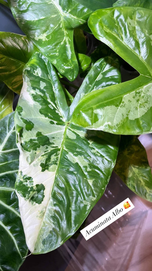 Alocasia acuminata Albo er en elegant og sjelden variegert form av den tropiske arten Alocasia acuminata. Den kjennetegnes av smale, pilformede blader med hvit til kremfarget variegasjon som kan variere fra fine marmoreringer til store, rene felter. Den hvite variegasjonen gir en vakker kontrast til den dype grønne bladfargen og de lyse bladnervene.
