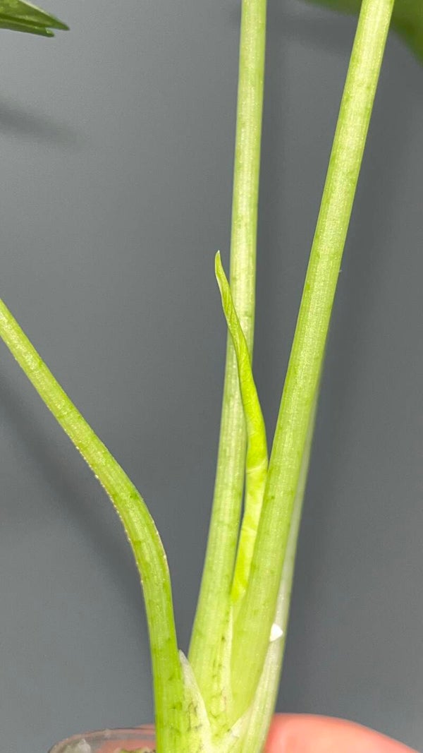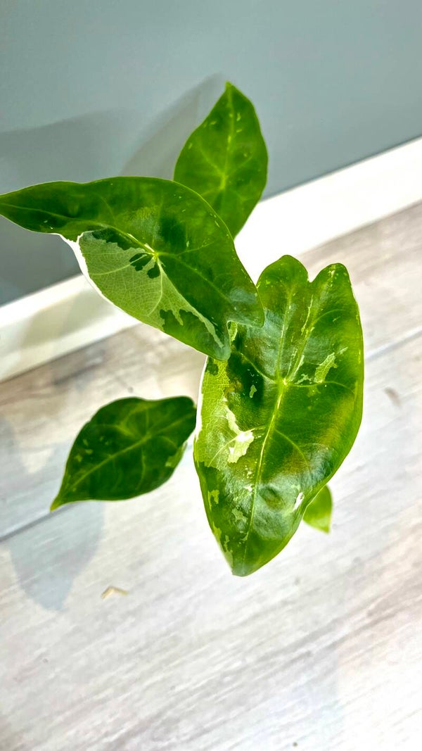En visuell perle for samlere, med sine smale og elegante bladform kombinert med dramatisk og uforutsigbar variegasjon. Ikke den enkleste Alocasiaen å holde perfekt, men desto mer givende når den trives.
