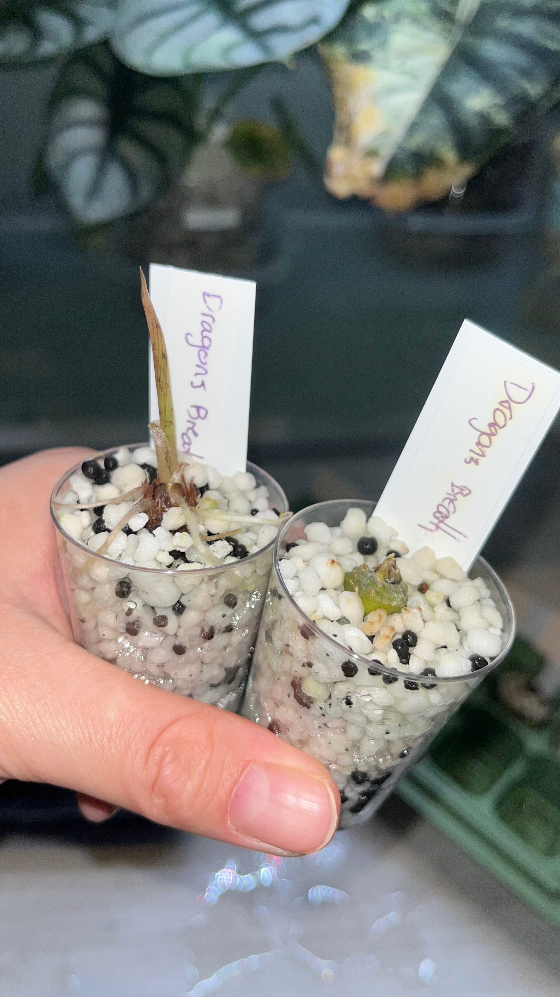 Jeg lar Dragon’s Breath-knoller ligge halvveis synlig i perlite og holder dem konstant fuktige, men ikke våte. Høy luftfuktighet og varme får spirene raskt i gang – og når det første bladet bryter frem, ser man allerede den karakteristiske glansen som gjør denne arten så spesiell.