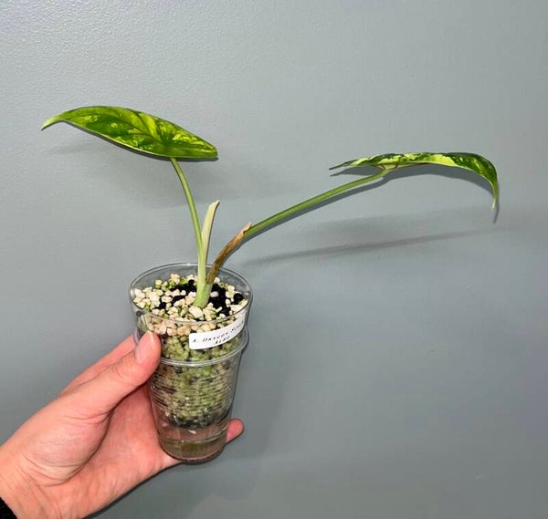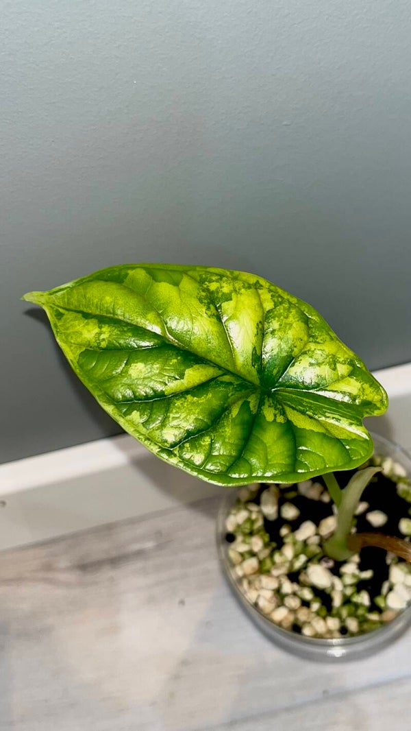 Alocasia Dragon Scale Albo er en ekte juvel blant Alocasiene – en variegert form av den populære Dragon Scale, kjent for sine markerte årer, læraktige struktur og glinsende overflate som minner om drageskinn. Denne varianten byr i tillegg på kremhvite og lysegrønne partier som danner et fantastisk kontrastspill mot den mørkere grunnfargen.